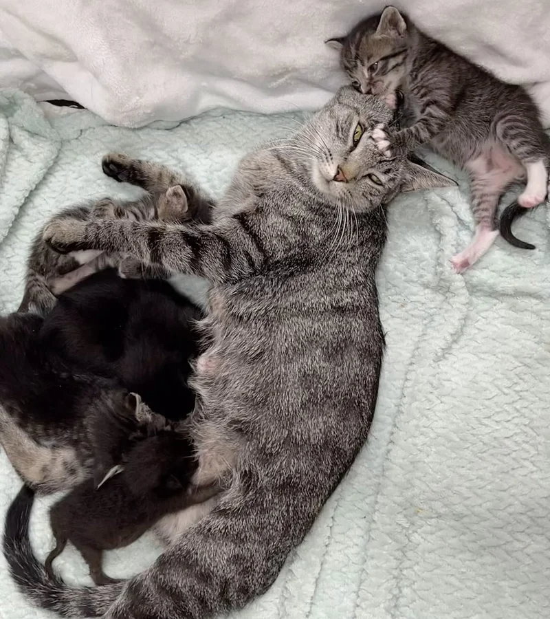 When Hadley’s eyes began to open, Ellen carefully placed her with Liberty and her kittens. To everyone’s joy, Liberty accepted Hadley instantly, allowing her to nurse and cuddle with her new siblings. Hadley found warmth, comfort, and love in this new feline family, and began to grow stronger every day.