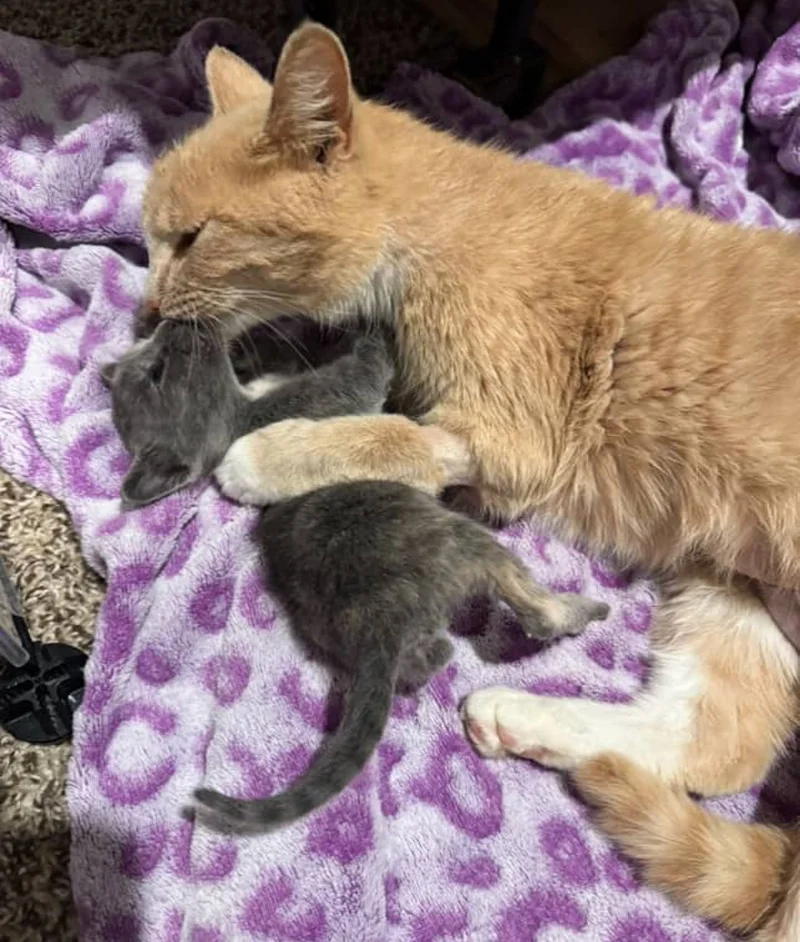 From that moment, Peaches showered the kittens with love and care. She washed their faces, cuddled them close, and comforted them to sleep. The little ones, in turn, thrived under her attention, gaining weight and growing stronger each day. Volunteers said that both Peaches and the kittens were healing together — she found renewed joy, and they received the nurturing they desperately needed.