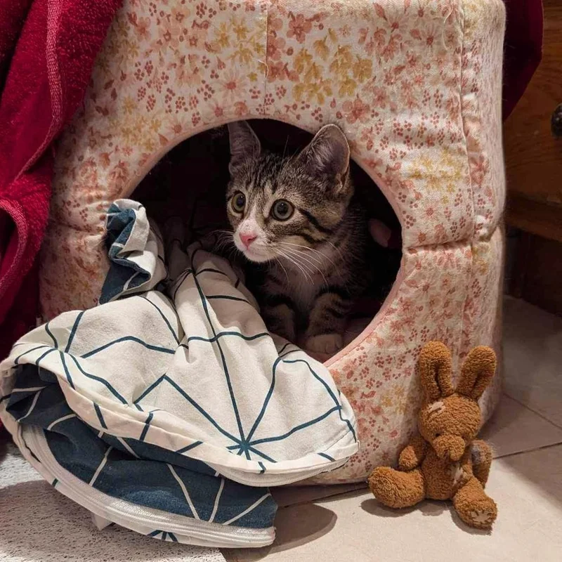 After several weeks of care, Claudie began to gain weight and energy. Her confidence grew, and she became a playful, mischievous kitten. “She loves following her humans everywhere, always curious about what they’re doing. She’s full of energy and can turn anything into a toy,” her foster mom shared.