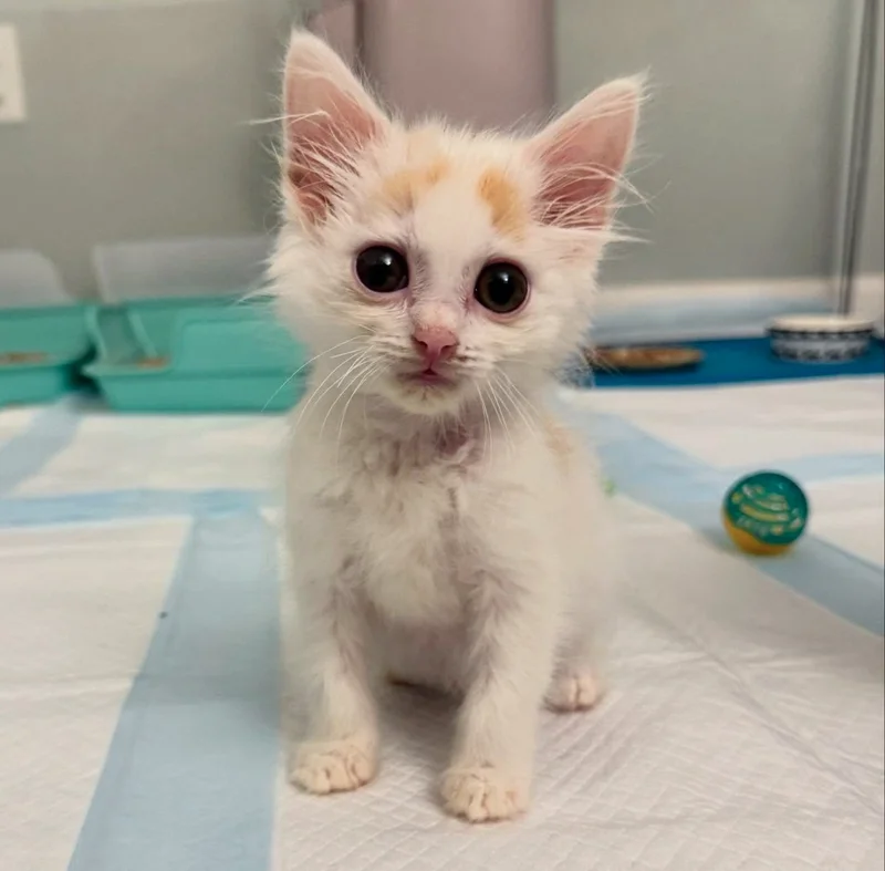 Angel, a pure white kitten with delicate features, was born with microphthalmia—a rare condition where her eyes never developed properly. She was completely blind from birth and needed immediate medical attention. The vet recommended a surgery called bilateral enucleation to remove her malformed eyes and prevent infections. Despite this, Angel amazed everyone with her bravery. Within days, she had mapped out her surroundings, learned every corner of her playpen, and confidently found her way to her litter box without help. Her determination showed that blindness would never hold her back.