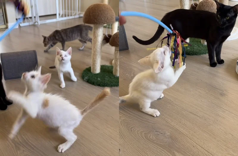 Another cat, Marvel, soon joined their growing group of friends. Despite being older, Marvel couldn’t resist Angel’s charm. The blind kitten’s playful confidence and gentle nature made her irresistible. After her recent eye surgery, Angel surprised everyone by recovering quickly. Within hours, she was chasing crinkle balls again, pouncing perfectly whenever she heard the sound of a toy bell. Her precision amazed the older cats, proving once again that she relies more on her heart than her sight.