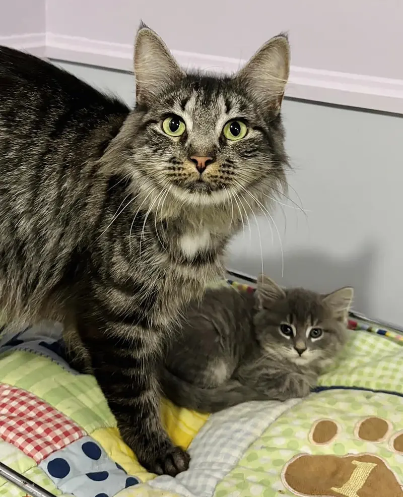 At only two years old, Tigger was still youthful and playful herself, yet she was a devoted mother. She showered her kittens with love, affection, and endless grooming sessions. But Rabbit received extra attention — Tigger often curled up beside her tiny gray baby during nap time, wrapping her in warmth and comfort. As the kittens grew into adventurous young cats, Rabbit remained inseparable from her mom, always choosing to stay close by her side.