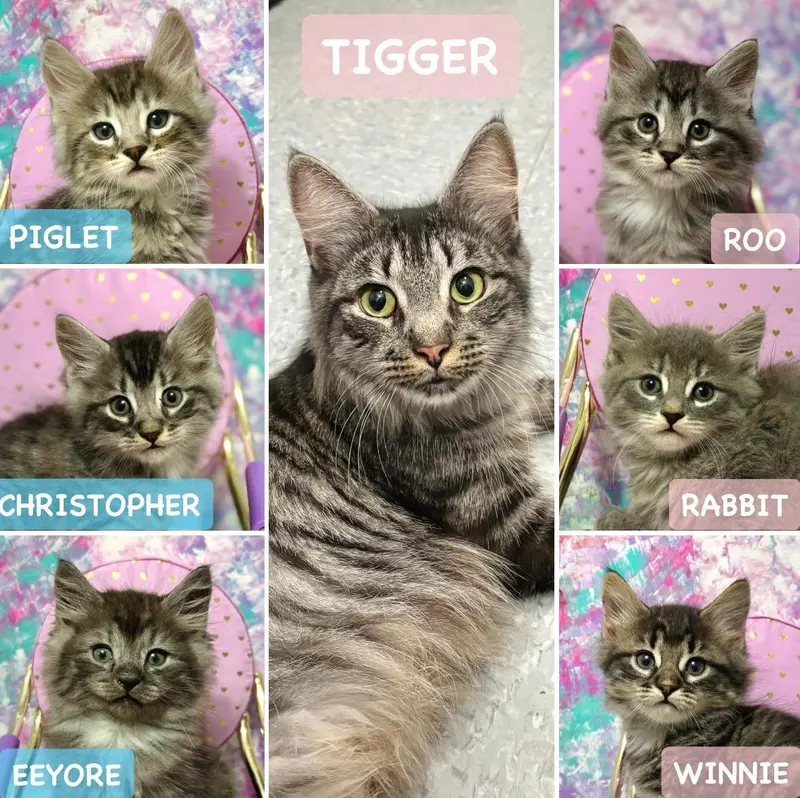 Tigger, a beautiful dark tabby cat, came to Exploits Valley SPCA with her six kittens, hoping for a better life. The staff welcomed the little family warmly, giving Tigger a safe, cozy nursery where she could nurse her babies in peace. They made sure she had endless food and gentle care, and soon all six kittens began to grow stronger each day, hitting all their little milestones under Tigger’s loving eyes.